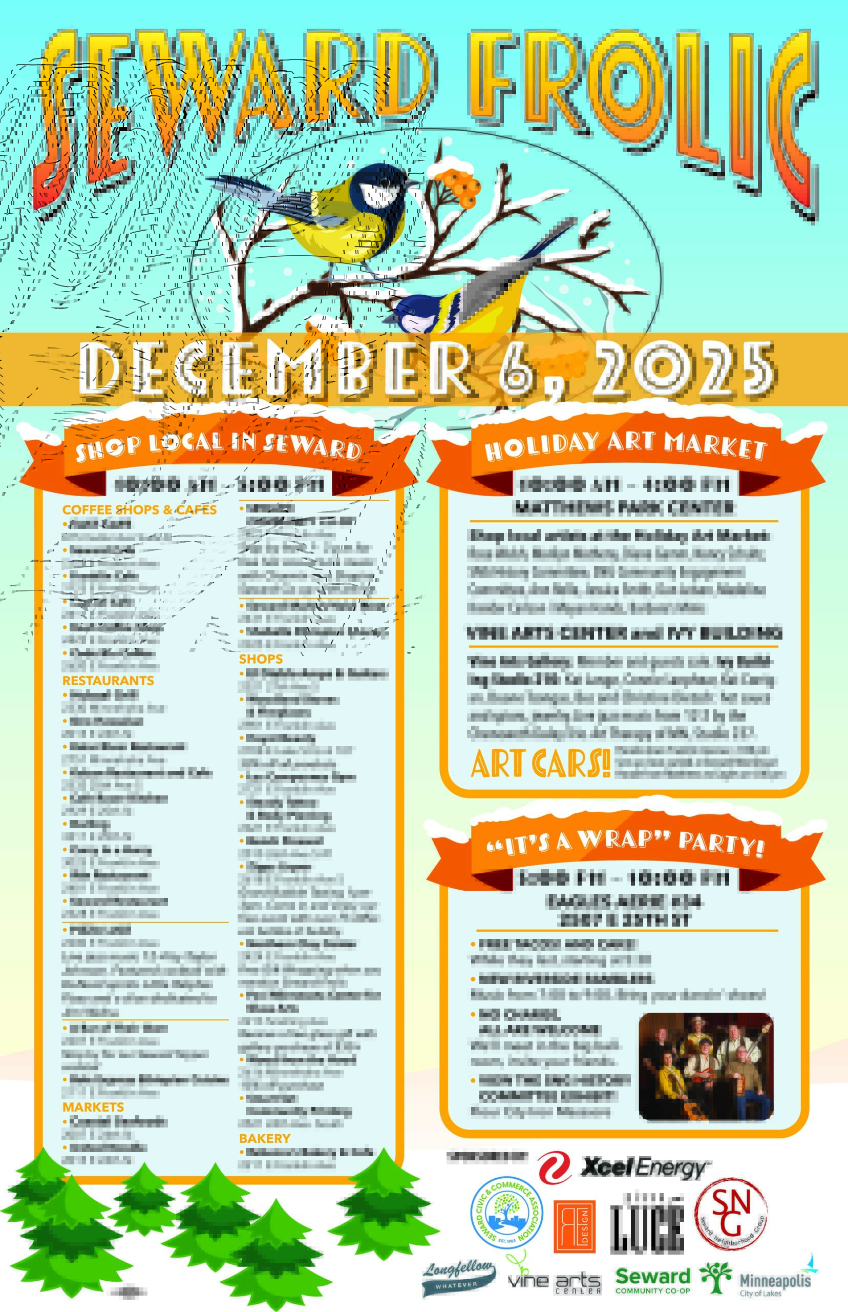 Step into holiday enchantment as the Seward Frolic & Holiday Art Market invites you to the heart of Minneapolis’ cherished and historic Seward Neighborhood nestled near the University of Minnesota campus. Organized by Seward Civic and Commerce Association, Seward Neighborhood Group, Vine Arts Center, and Redesign, the event will feature special sales and events at local businesses, along with a Holiday Art Market showcasing local artists and artisans at Matthews Park Recreation Center.
